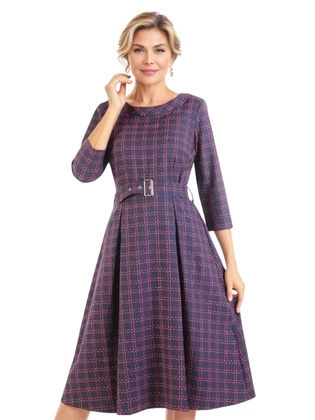 Modna sukienka w pepitkę 17149, elegancka kreacja z ozdobnymi lamówkami.