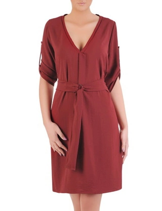 Bordowa sukienka damska z paskiem i podwijanymi rękawami 32540