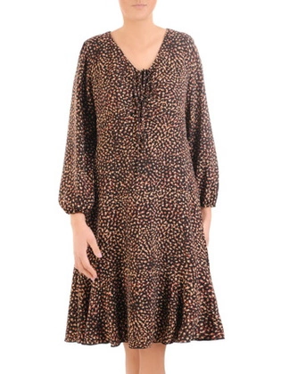 Luźna sukienka z tkaniny, kreacja z ozdobnym wiązaniem na dekolcie 31381