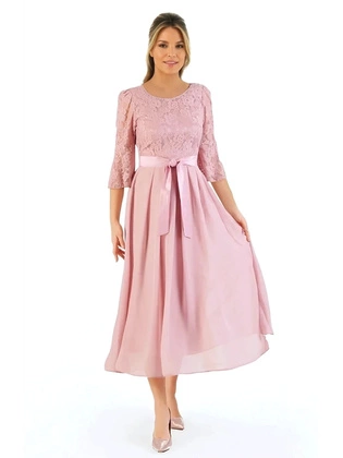 Pudrowa sukienka midi, elegancka kreacja z rozcięciem 30125