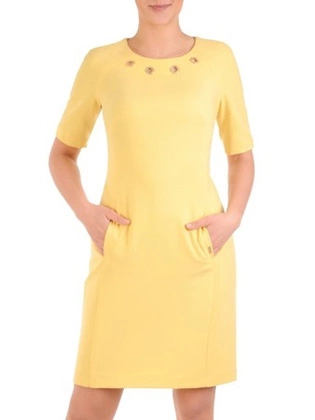 Wizytowa sukienka damska, żółta kreacja z ozdobnym dekoltem 29849