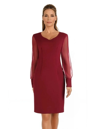 Bordowa sukienka z tiulowymi rękawami 14433, wieczorowa kreacja z ozdobnym dekoltem.