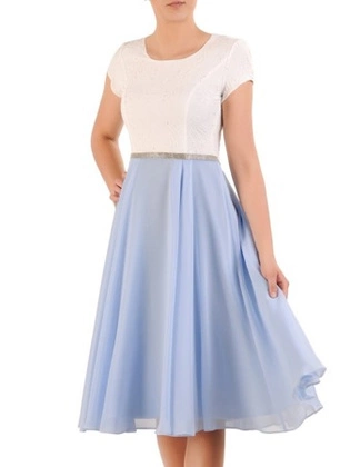Rozkloszowana sukienka z tkaniny, kreacja z paskiem w drobne groszki 23462