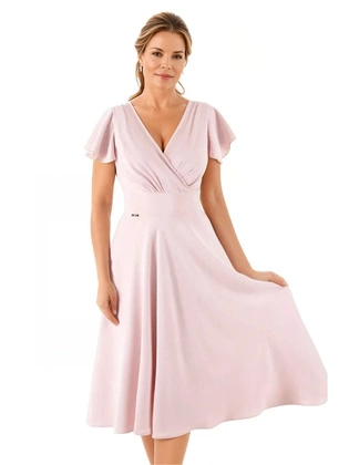 Sukienka na wesele, pudrowa rozkloszowana sukienka midi z tiulową wstawką przy dekolcie 38501