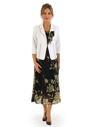Elegancki komplet damski na wesele, komunię – sukienka w kwiaty z gładkim żakietem na jeden guzik, stylowy i szykowny zestaw 39634