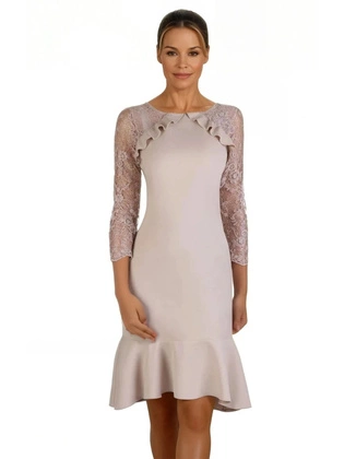 Wyszczuplająca sukienka z baskinką, kreacja z koronkowymi rękawami 22681