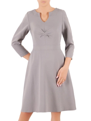 Grafitowa sukienka z broszką 18236, wyszczuplająca kreacja z ozdobnym dekoltem.