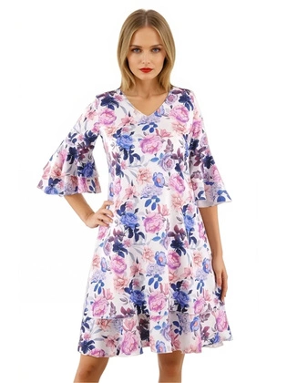 Rozkloszowana sukienka w kwiaty, kreacja z gumkami na rękawach 29528