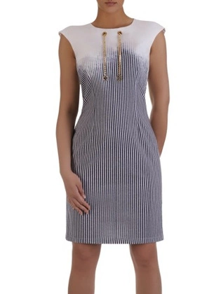Sukienka z ozdobnym łańcuszkiem przy dekolcie 16140, modna kreacja w paski.