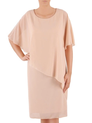 Pudrowa sukienka z szyfonu, kreacja z ozdobnym plisowaniem 30030