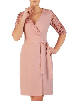 Elegancka pudrowa sukienka, kreacja z koronkowymi rękawami 28756
