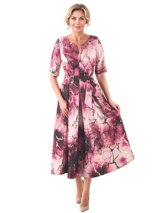 Zwiewna rozkloszowana sukienka na wesele i komunię – elegancka kreacja z paskiem i oryginalnym wzorem 39836