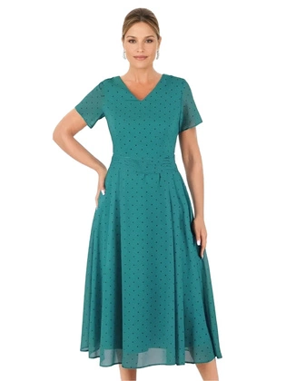 Sukienka na wesele w groszki, wyszczuplająca, zwiewna kreacja rozkloszowana 36460