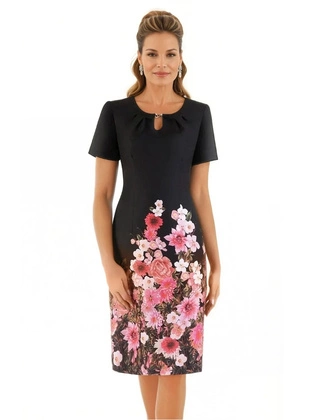 Wyszczuplająca sukienka w kwiaty Debora IV, elegancka kreacja z atrakcyjnym dekoltem.