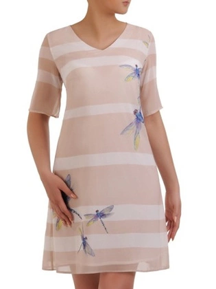 Prosta pudrowa sukienka, kreacja z ozdobnie wyciętym dekoltem 28188