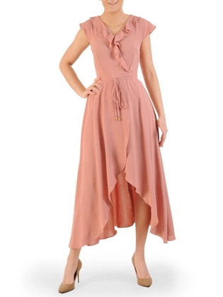 Sukienka kopertowa, asymetryczna kreacja z falbanami 32523