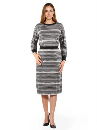Wzorzysta sukienka dzianinowa midi, czarno-szary model idealny na co dzień i do pracy 40356