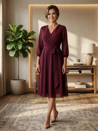 Fioletowa sukienka kopertowa midi – elegancka sukienka z szyfonu na wesele, rękaw 3/4 40246