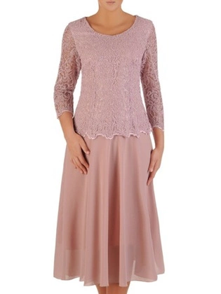 Szyfonowa sukienka z koronkowym topem, pudrowa kreacja na wesele 22001.