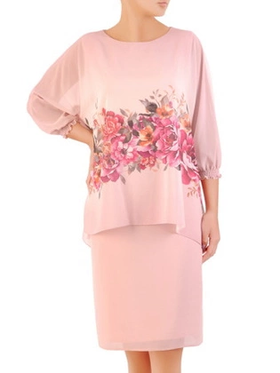 Szyfonowa sukienka z maskującą narzutką i kwiatowym printem 33014