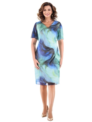 Sukienka midi z kopertowym dekoltem i bufiastymi rękawami – elegancka sukienka na wesele w odcieniach niebieskiego i beżu 40160