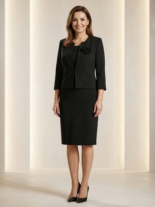 Elegancka czarna garsonka damska – sukienka midi z żakietem z odpinanym kwiatem 37230