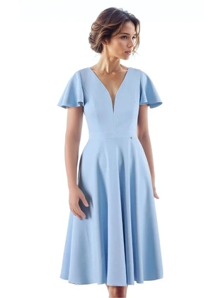 Sukienka na wesele, błękitna rozkloszowana sukienka midi z tiulową wstawką przy dekolcie 38499