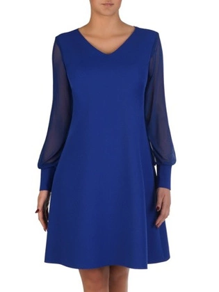 Trapezowa sukienka z modnymi rękawami 18312, chabrowa kreacja wizytowa.
