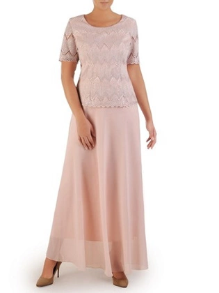 Długa suknia na wesele, pudrowa kreacja z koronkowym topem 21987