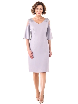 Sukienka z ozdobnymi mankietami 15189, nowoczesna kreacja w szarym kolorze.
