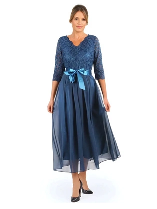 Niebieska sukienka w prostym fasonie, elegancka kreacja z koronki i tkaniny 20005.