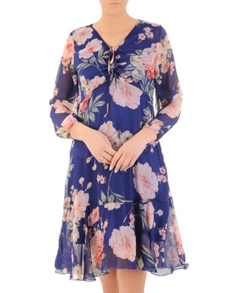 Luźna sukienka z szyfonu, kreacja z ozdobnym wiązaniem na dekolcie 33326