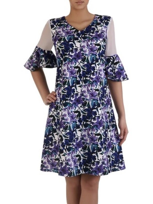 Trapezowa sukienka w kwiaty 16136, kreacja z modnymi, prześwitującymi rękawami.