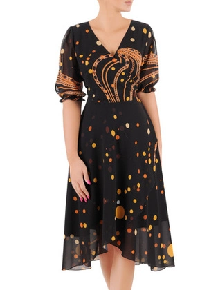 Kopertowa sukienka z zakładkami, modna kreacja w grochy 23271