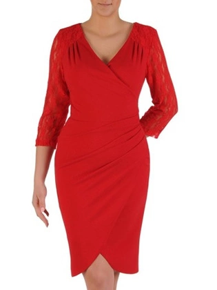 Czerwona sukienka, kopertowa kreacja z koronkowymi rękawami 20049.
