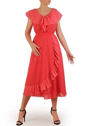 Sukienka wyjściowa, koralowa kreacja z falbanami 26382