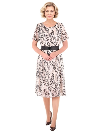 Pudrowa sukienka z szyfonu, kreacja z wyszczuplającymi marszczeniami 33557