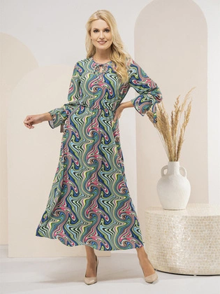Rozkloszowana sukienka damska, wyszczuplająca kreacja w modny wzór 38630