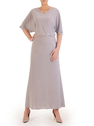 Suknia maxi z połyskującej dzianiny, kreacja z kopertowym dekoltem 31520