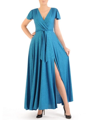 Wieczorowa, kopertowa suknia maxi z połyskującego materiału 34530