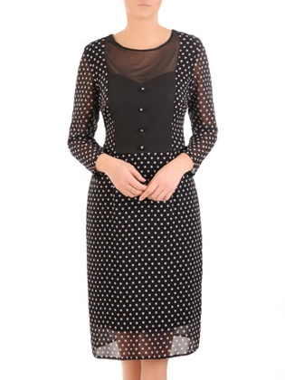 Prosta sukienka w groszki, kreacja z modną wstawką na dekolcie 31469