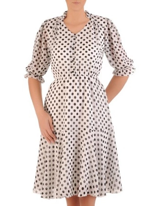 Modna, rozkloszowana sukienka w grochy 14995, wiosenna kreacja wyszczuplająca.