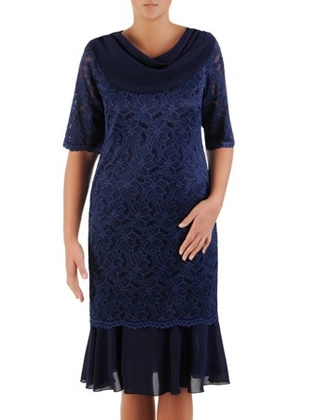 Sukienka z ozdobnym szalem, granatowa kreacja z koronki 21981
