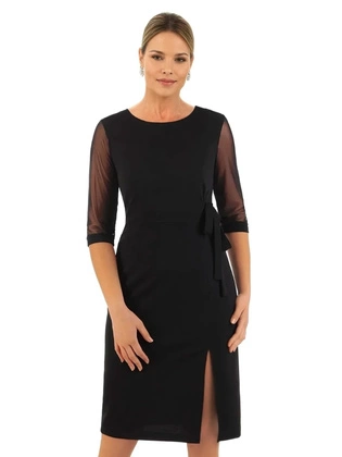 Trapezowa sukienka wizytowa z tiulem – czarna sukienka koktajlowa z falbaną i paskiem 40236