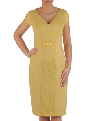 Żółta sukienka z koronkową wstawką Dana, kreacja z bufiastymi rękawkami.