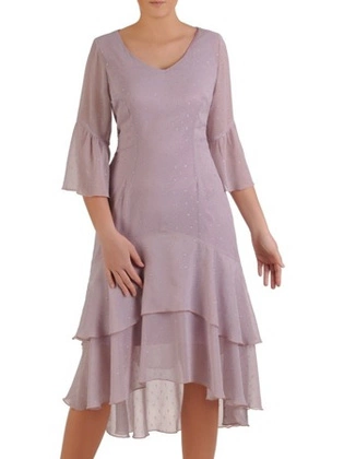 Sukienka z ozdobną falbaną, wrzosowa kreacja z szyfonu 25334