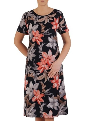 Granatowa sukienka w kwiaty, trapezowa kreacja z tkaniny 24934