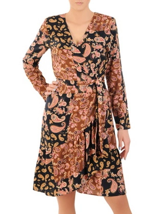 Kopertowa sukienka w modnym wzorze, kreacja z asymetryczną falbaną 31174