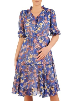Trapezowa, szyfonowa sukienka z modną falbaną i bufiastymi rękawami 31923
