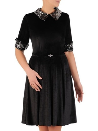 Rozkloszowana sukienka z aksamitu, czarna kreacja ozdobiona cekinami 23667